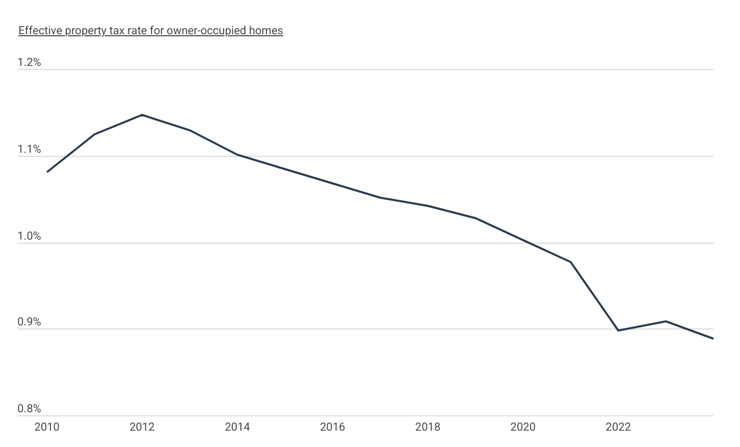 While homeowners might expect recent surges in home values to directly translate to higher property tax bills, the reality is more complex. Nationwide, the effective property tax rate—the total taxes paid as a percentage of the aggregate value of owner-occupied housing—has steadily declined over the past decade. After peaking at 1.147% in 2012, the effective rate fell to 0.898% in 2022, its lowest level in over a decade. Despite a brief rebound to 0.909% in 2023, the rate dropped again to 0.888% in 2024—remaining well below its peak—underscoring the persistent disconnect between rising home values and tax assessments.